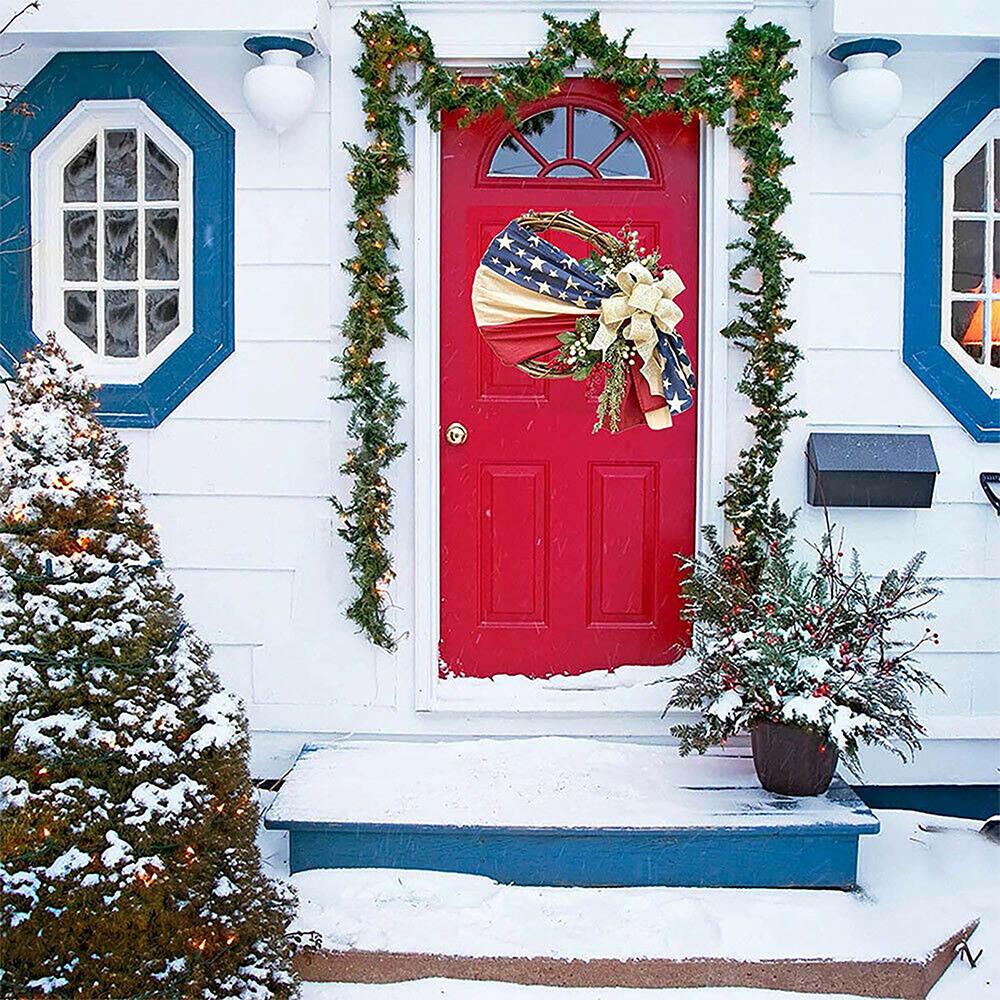 Wreath elements:American flag design is added to the rattan circle, with white bowknot, red and white small fruits and simulated leaves. Create a strong American Independence Day festive atmosphere with a full sense of design.