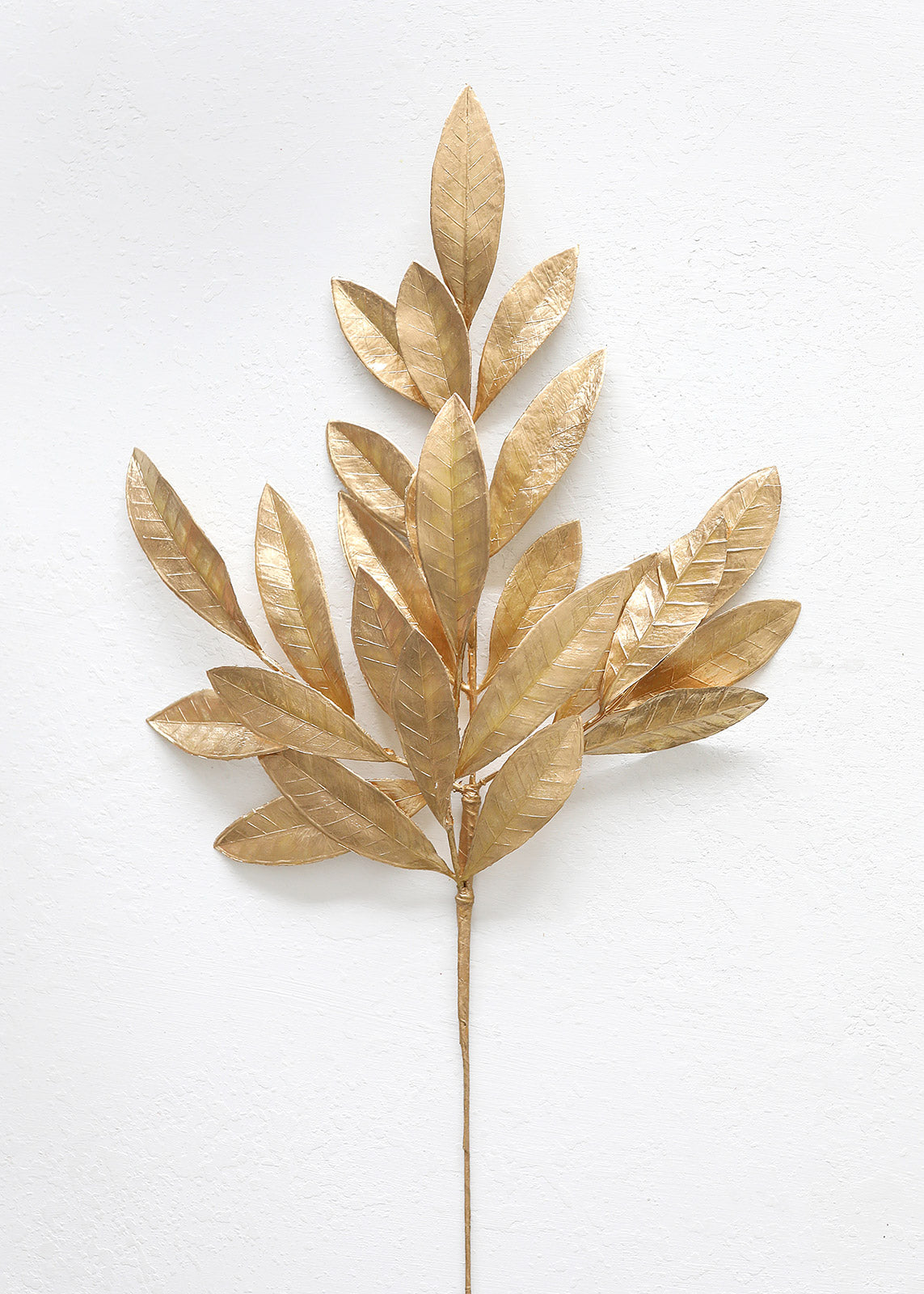 Get festive, with this gold metallic fake bay leaf spray. Accent your faux holiday greenery, garlands, or floral arrangements with a hint of gold, or trim down to add an extra something special to your holiday gift wrap. The artificial bay leaf stem is fully wired for easy styling, but easy enough to trim down for any floral projects.