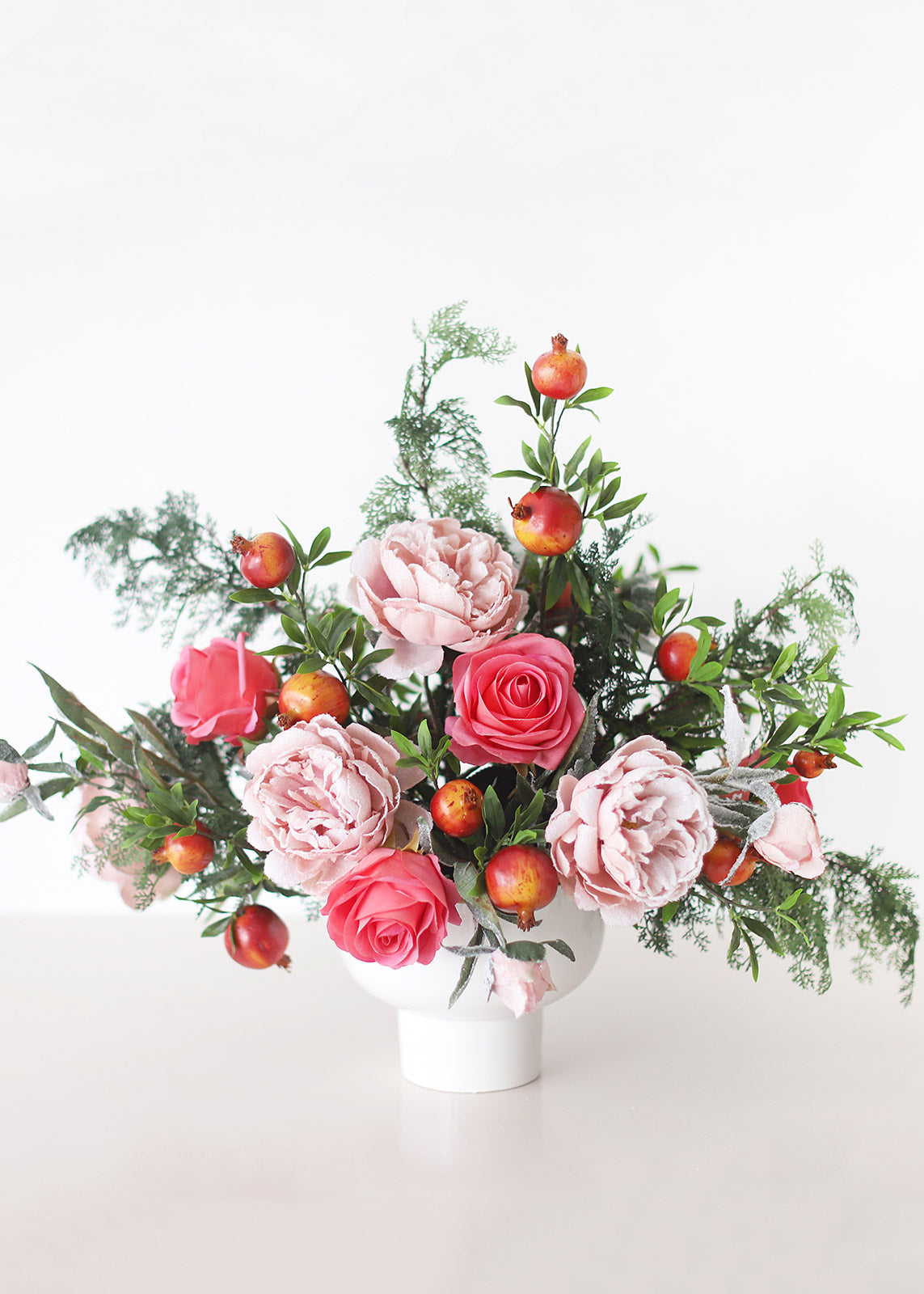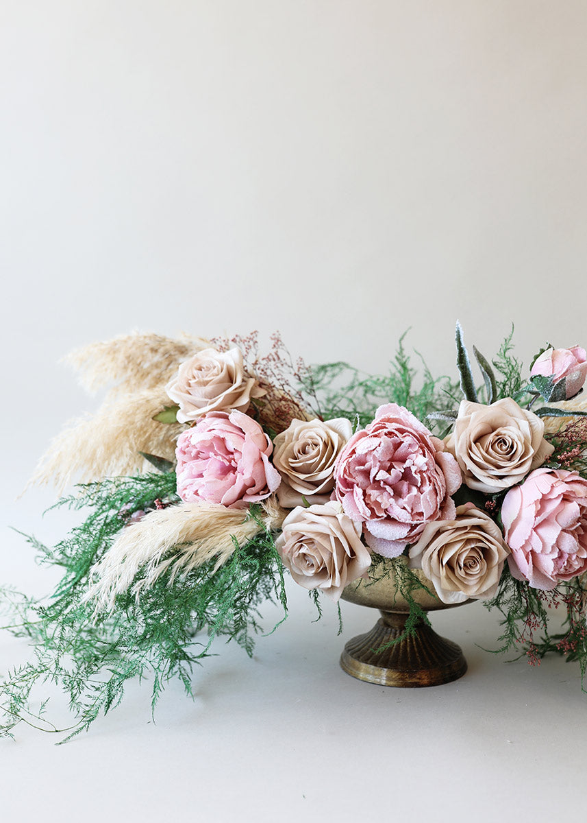 Beautiful pink blush faux peony flowers stem is sprinkled with a white dusting that gives it a snowed look. Style this snowy peony into Christmas wreaths and holiday floral arrangements for a soft, elegant look.