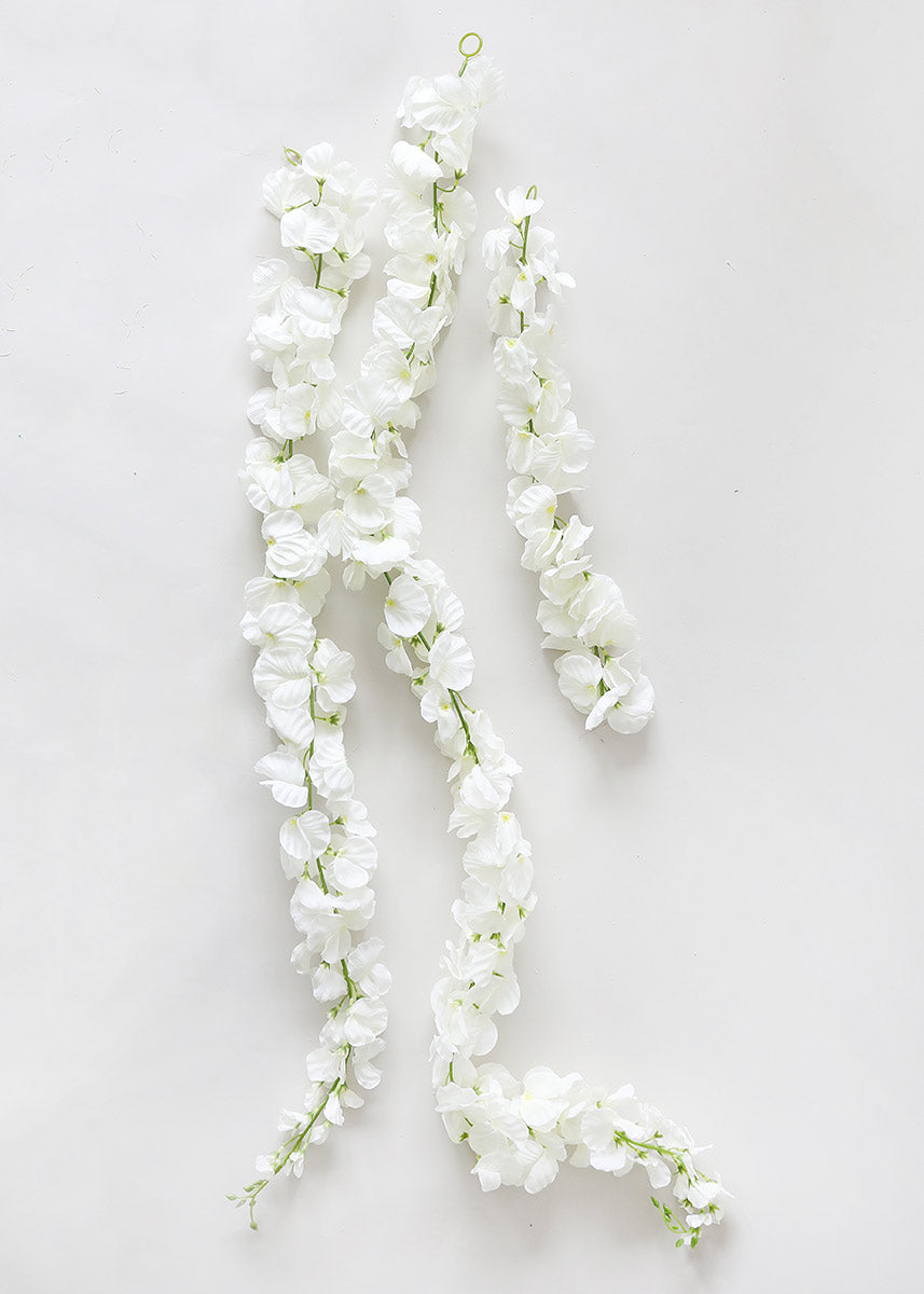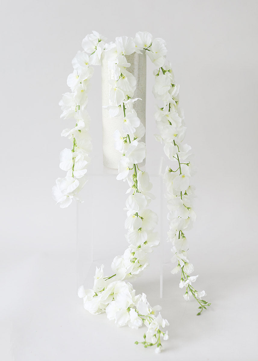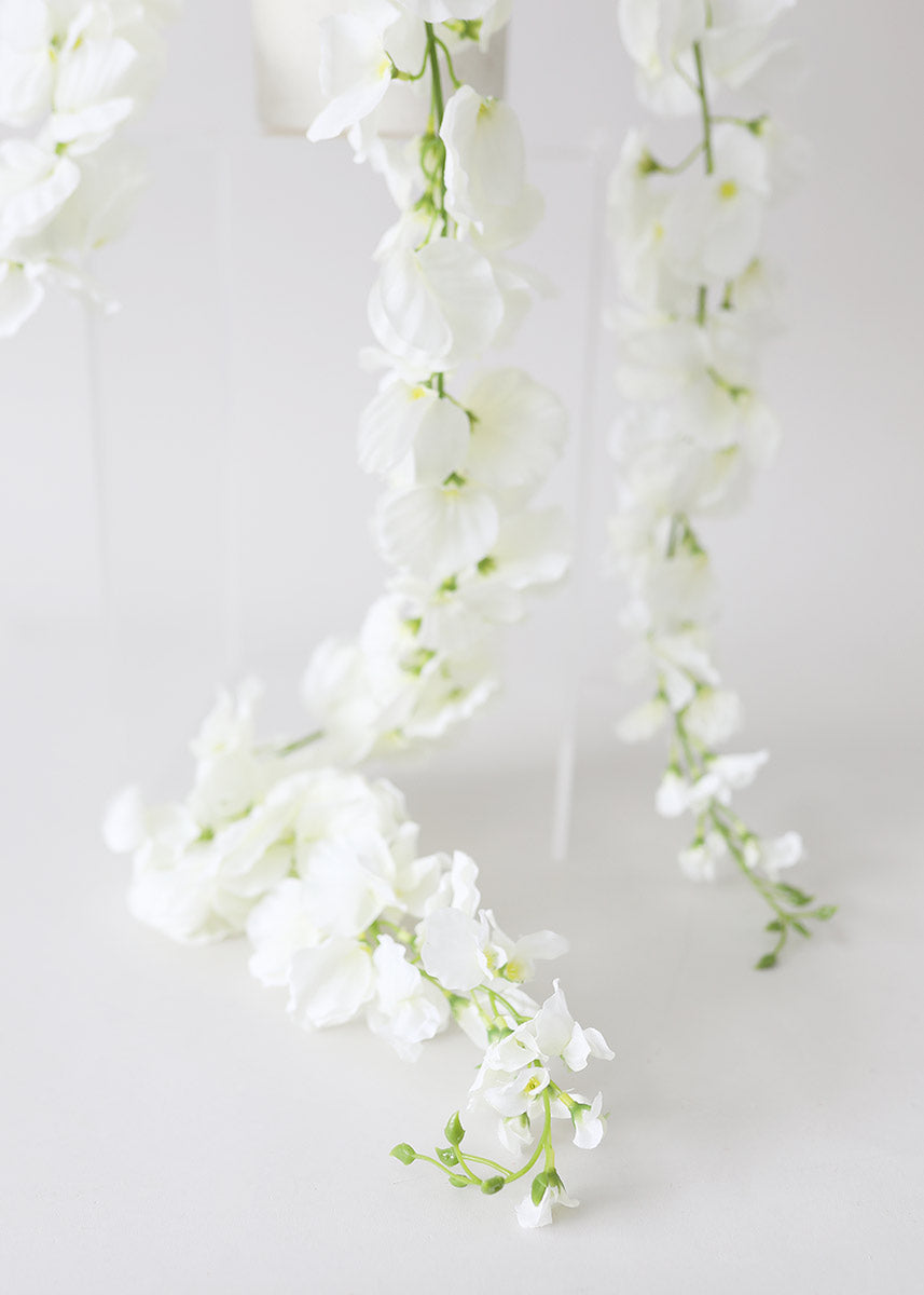 Find artificial hanging flowers for your wedding centerpieces like this classically elegant white silk wisteria. These strands of fake flowers can be turned into a garland, or create beautiful hanging floral installations.