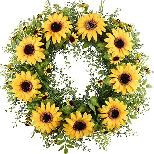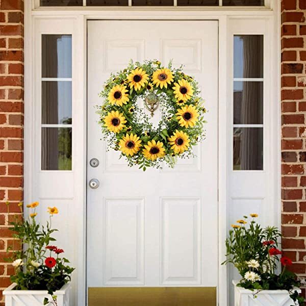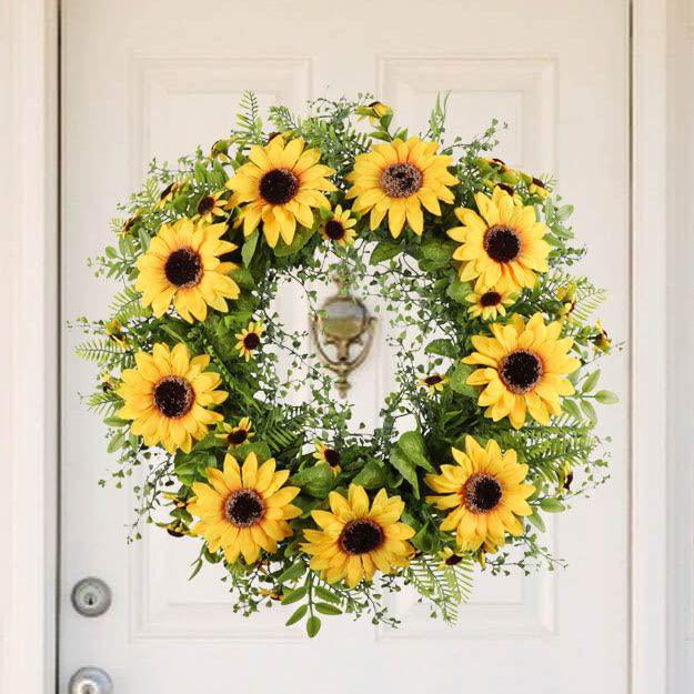 Beautiful Spring and Summer Wreath, Filling with green leaves and yellow flowers. Choose the right size helps to add a touch of color and the feel of nature to your home., more elegant! This wreath will bring an enjoyable ambiance all year round. Unique Design - Sunflower blooms and leaves are long lasting soft and pliable and look very realistic. The wreath base has holes to facilitate your hanging at indoor or outdoor.