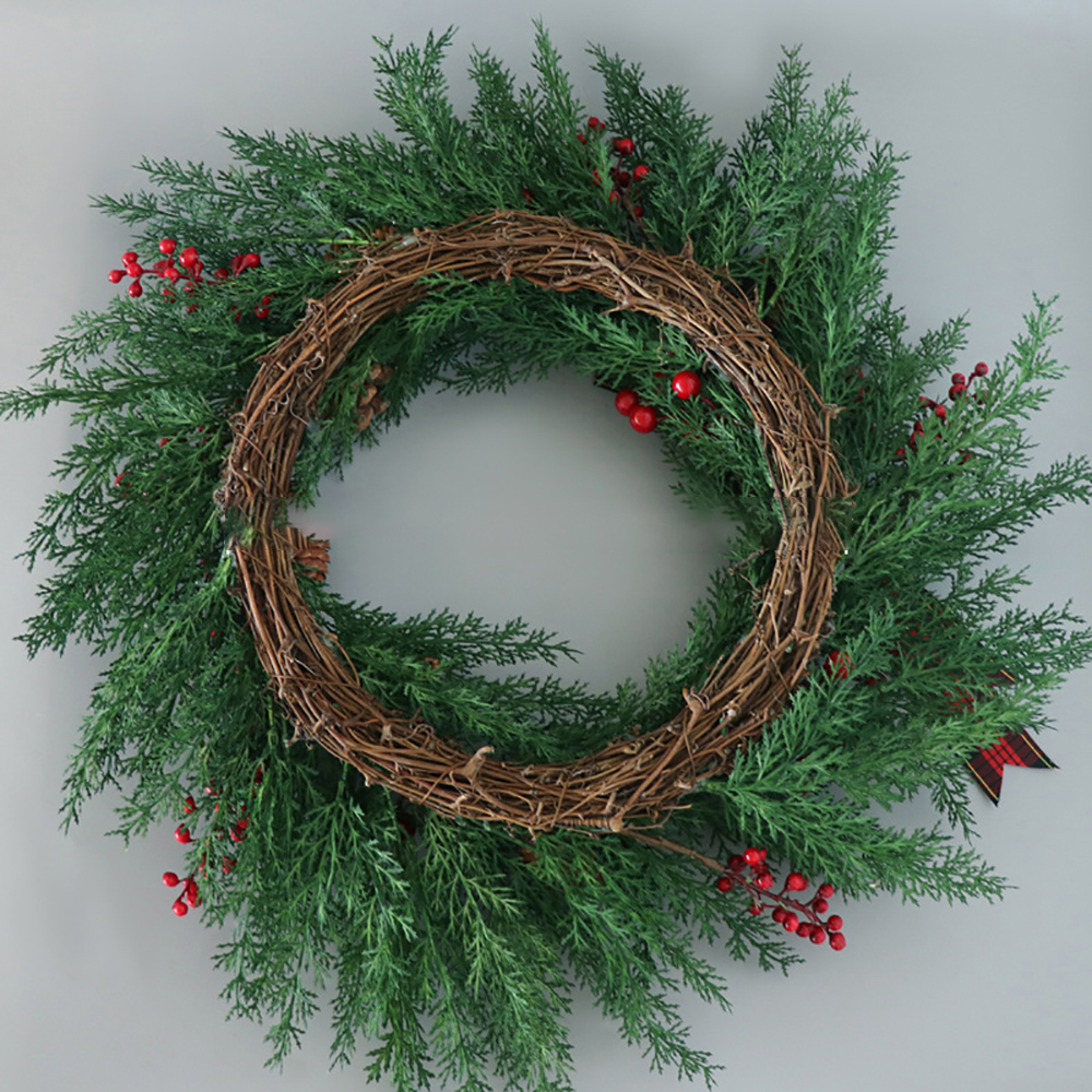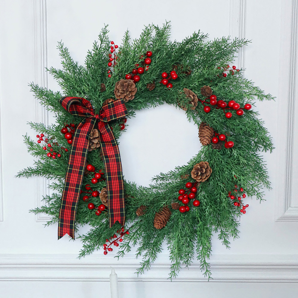 Style: green round wreath, simple and elegant. It is decorated with imitation leaves, pine needles and pine cones, berries, ribbon bows, rattan rings and other accessories. The combination of red and green is just right, making people shine.
