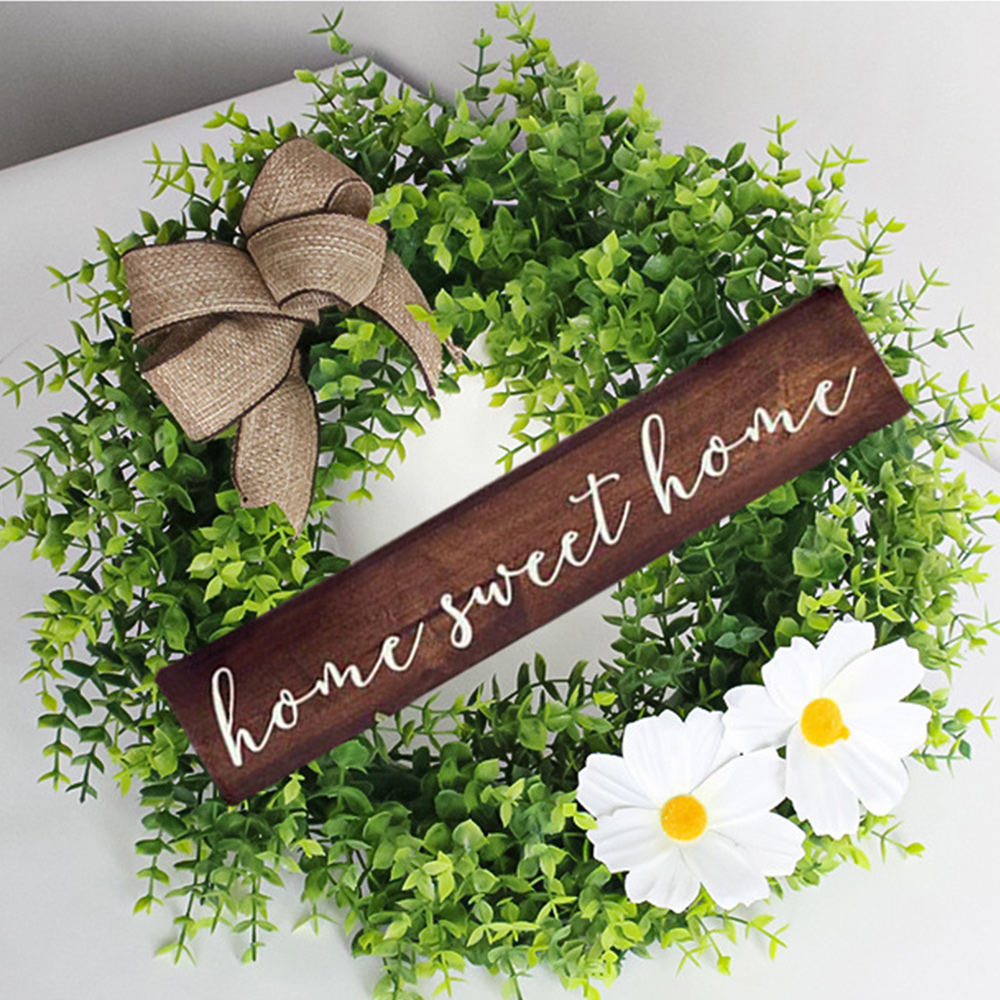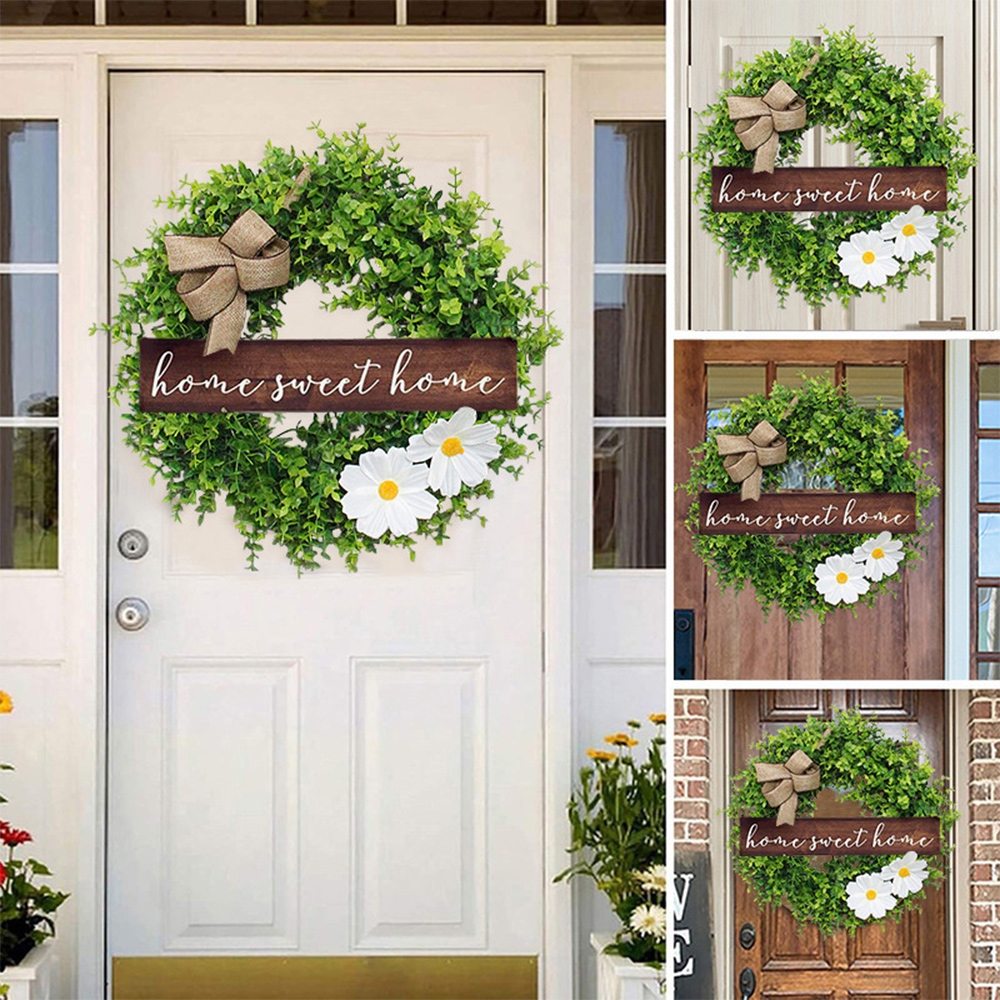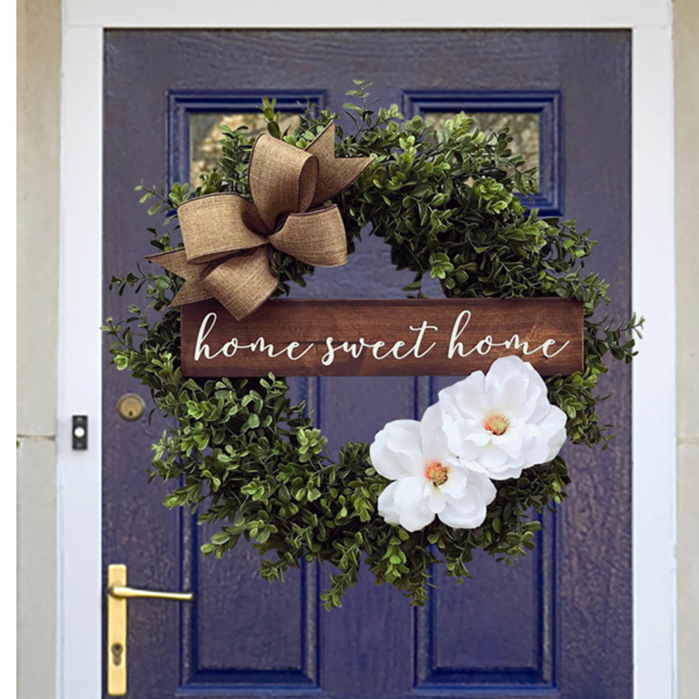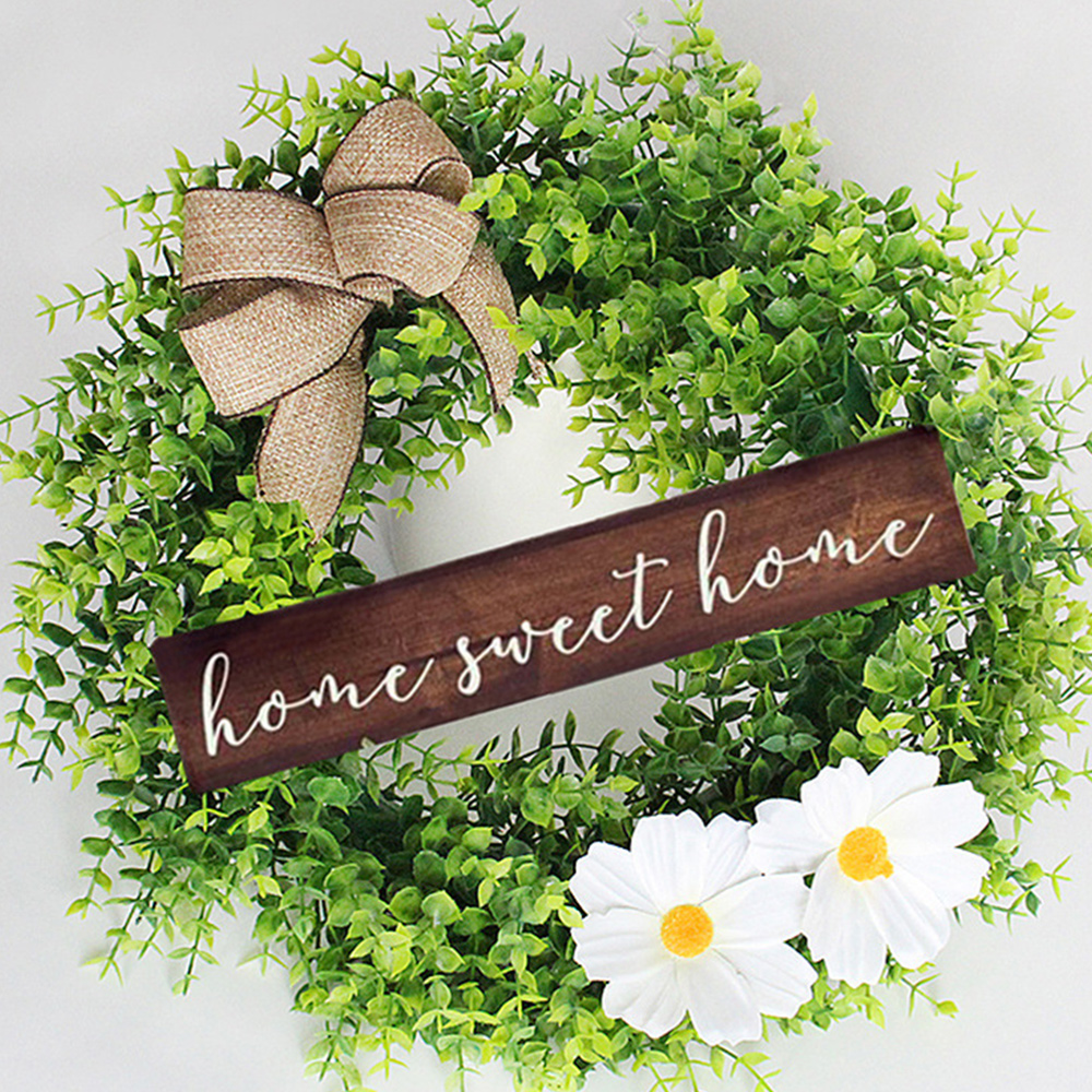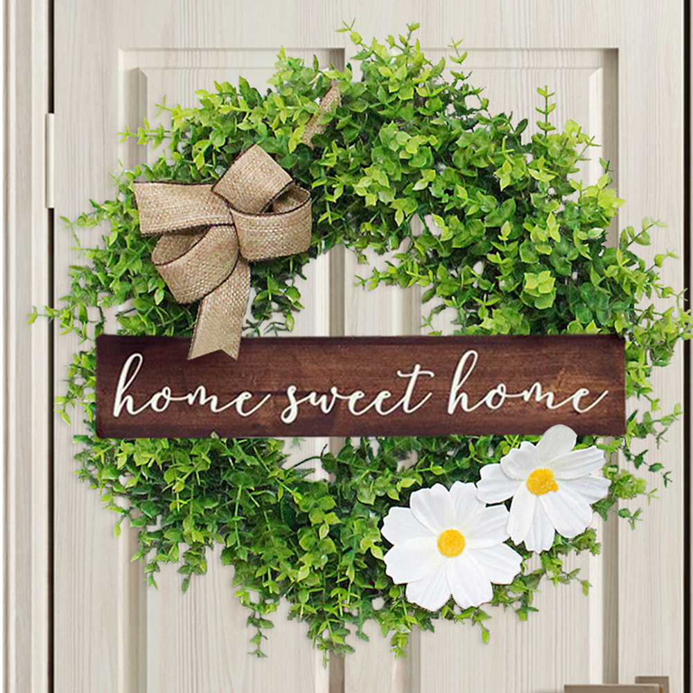 This is a garland door ornament with a bow, green leaves, two white flowers and the lettering 'home sweet home' to make this rustic door ornament look lovely and wonderful. The rich green is full of life. Bring a sense of joy