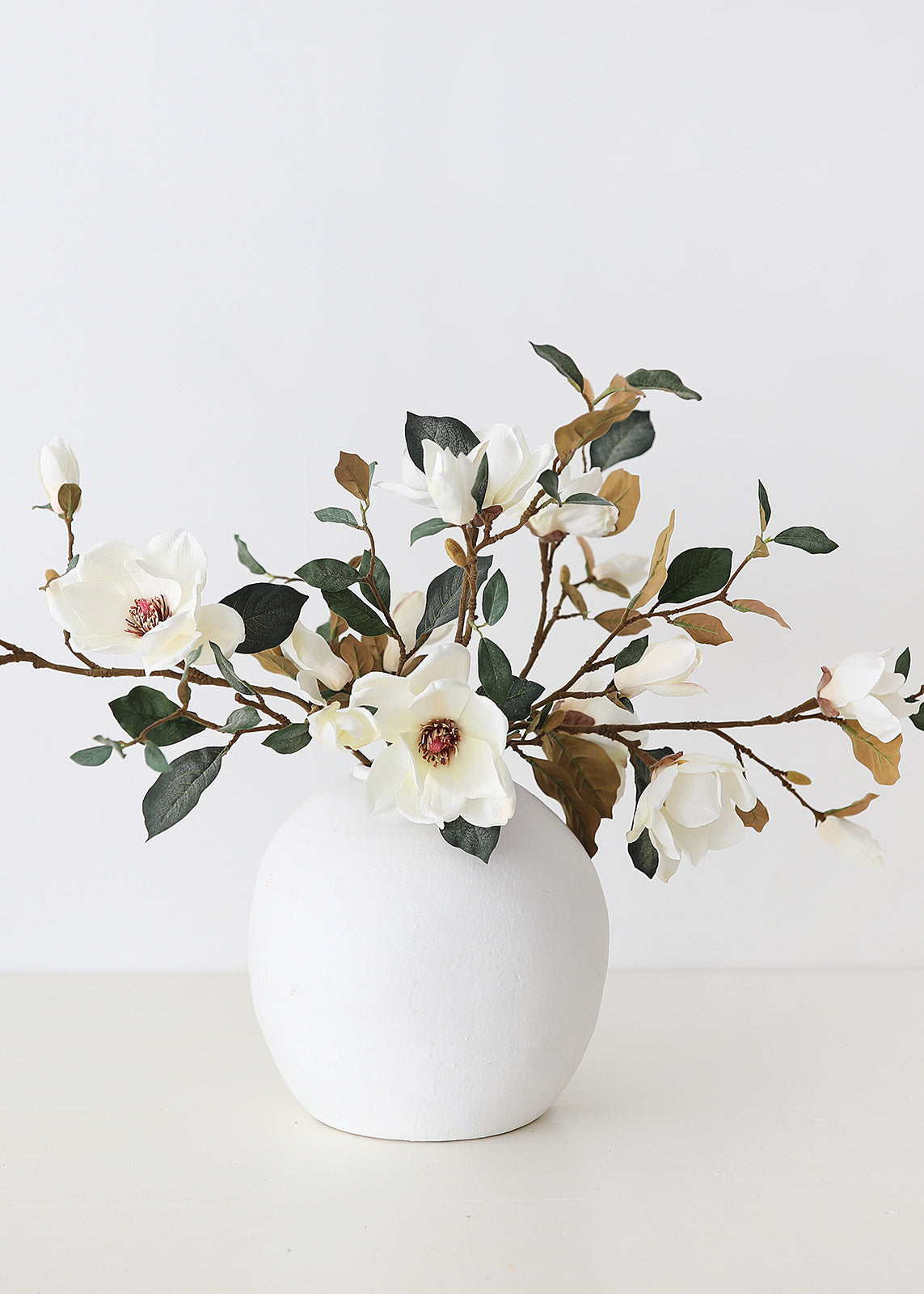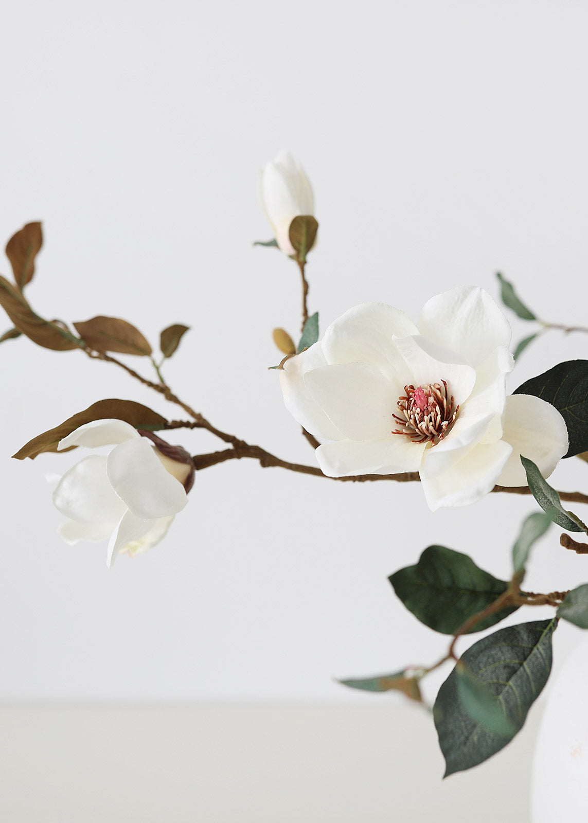 Simple styling has never been more simple, or beautiful! These artificial cream magnolia stems are perfect for any space or any season. Bold enough to be styled alone, yet make the perfect neutral focal bloom for your spring centerpieces. This realistic faux magnolia stem offers blooms that are fully open as well as partially open for an ultra-realistic look.