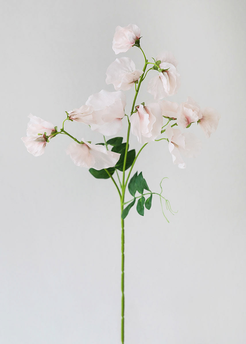 Take a walk on the delicate side, with these soft pink and cream artificial sweet pea flowers. The slightly folded petals of the sweet pea are the perfect whimsical bloom for your faux floral arrangements or bouquets. The barely-blush tone of this wispy flower adds something special without overpowering your arrangements or bouquets.