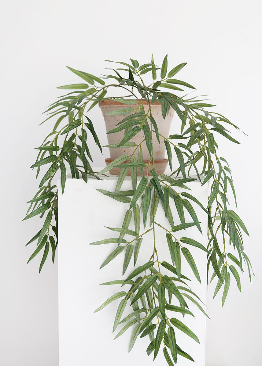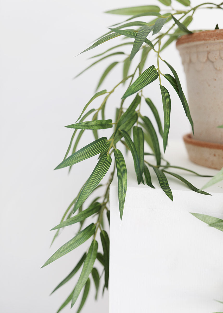 Looking for artificial bamboo plants? This lush green fake bamboo leaves hanging plant offers you versatility. Easily style it in a planter for a draping effect, or mix with faux flowers to create a stunning tropical centerpiece.