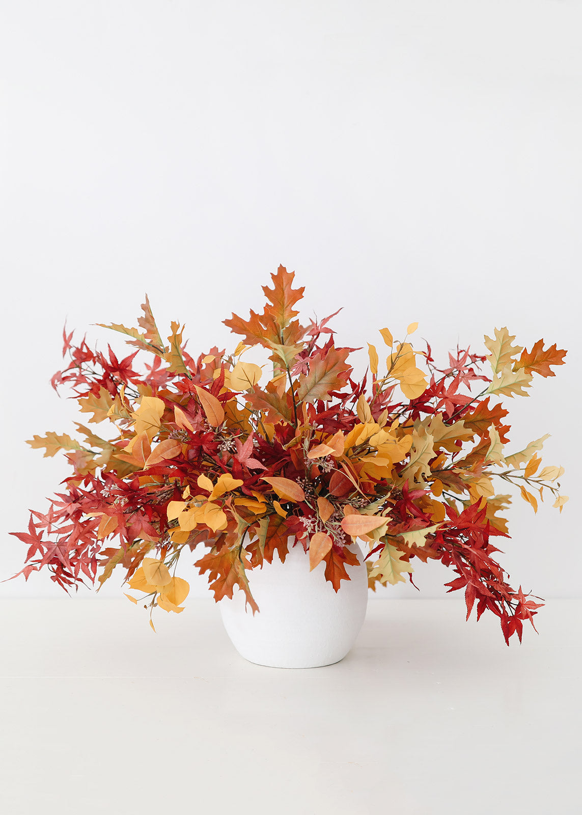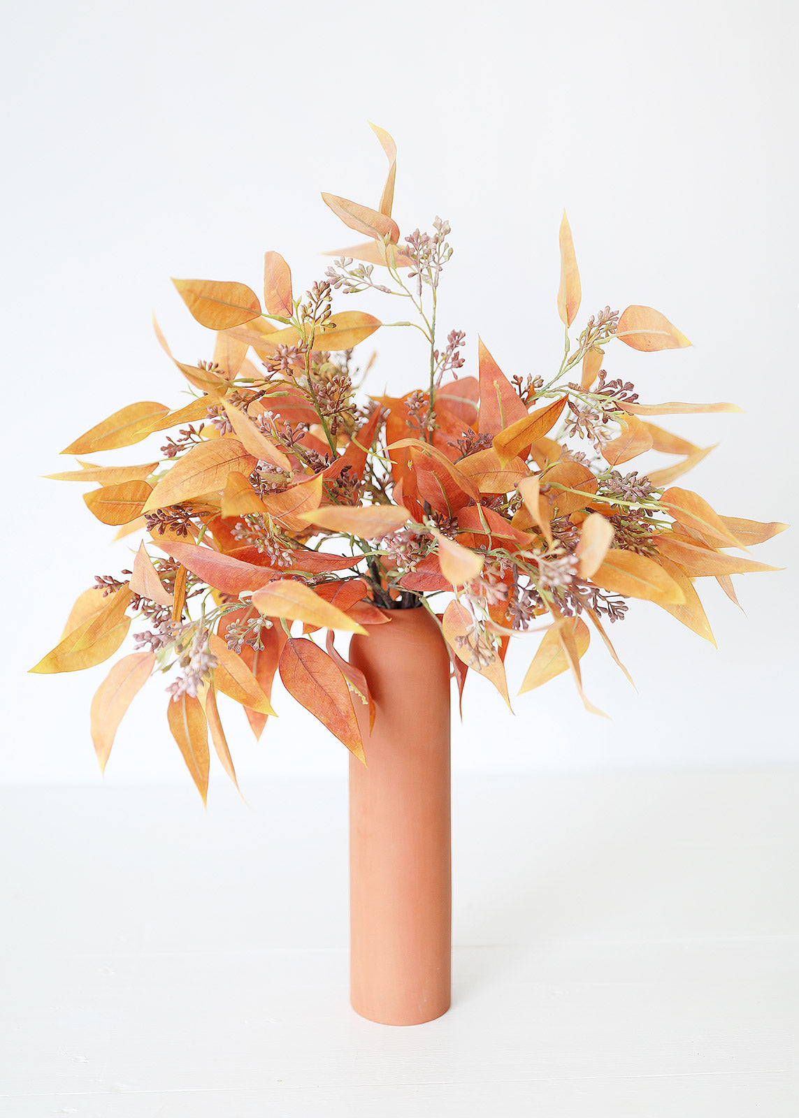 Styling with silk artificial fall leaves is a simple approach to decorating your home for autumn. Give your floral wreaths and vase arrangements warm hues with these terracotta fake seeded eucalyptus leaves.