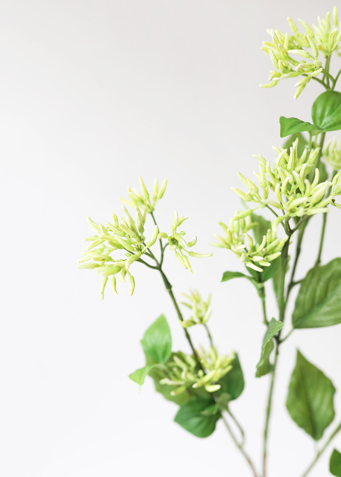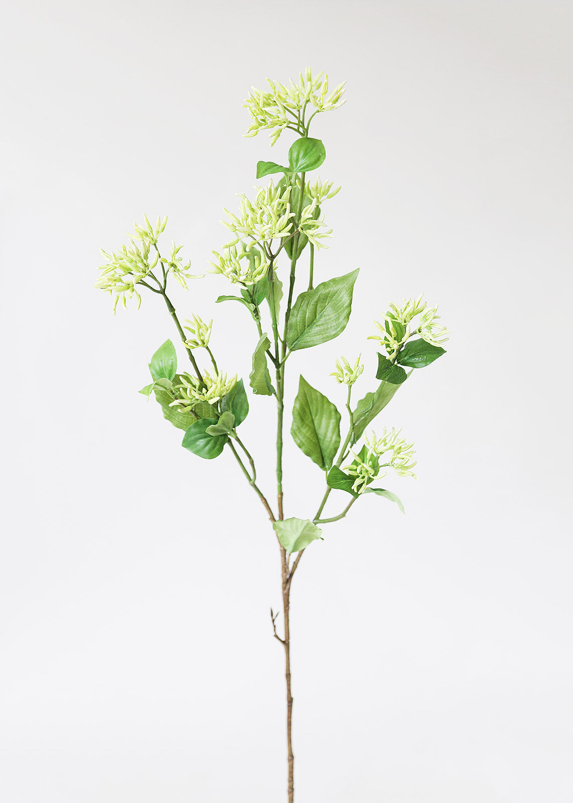 Find artificial stems to add textural elements to your floral designs, like this branch with light green fake seeded dogwood cluster blooms and leaf foliage. Its fresh color perfectly complements spring flower arrangements.