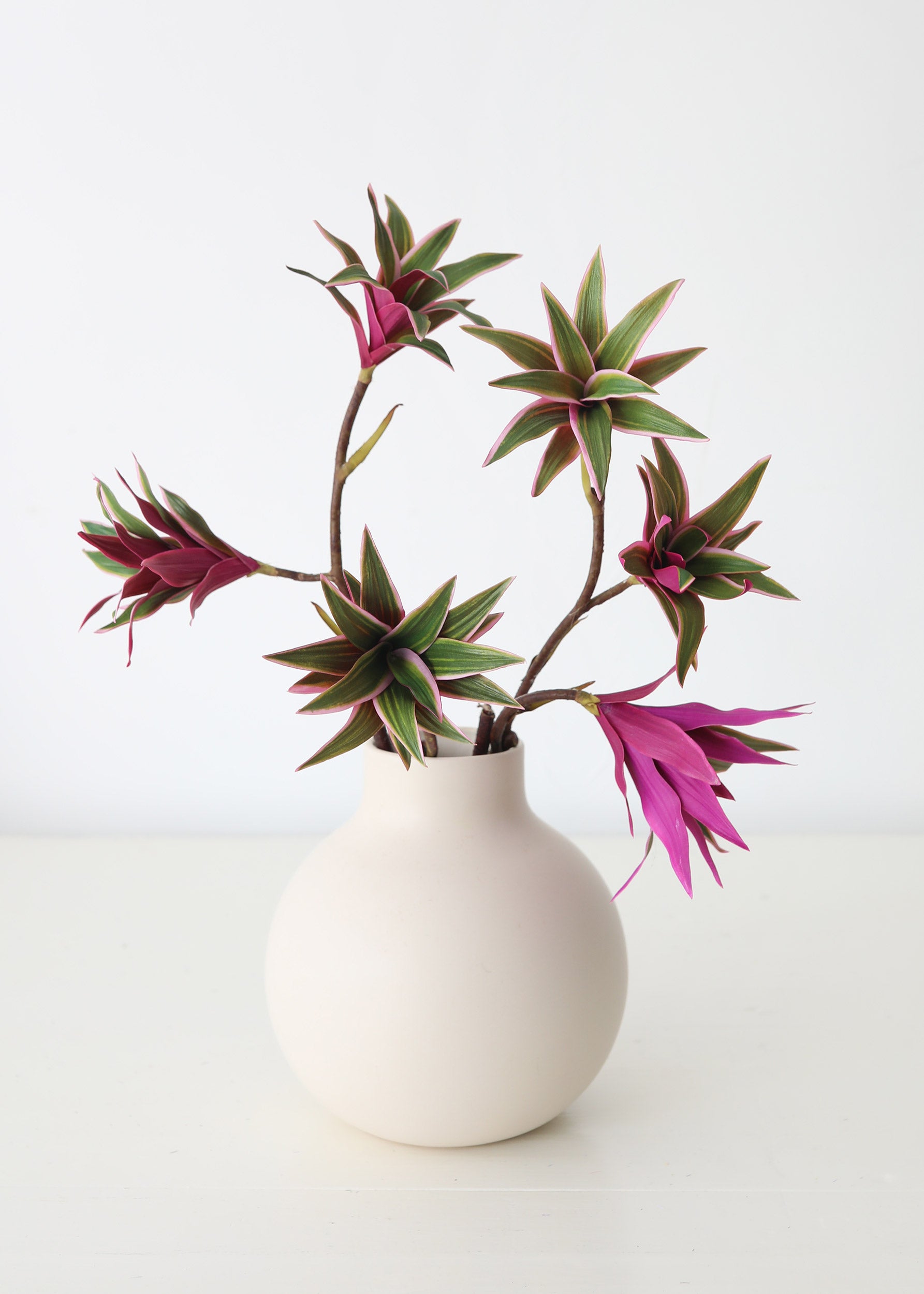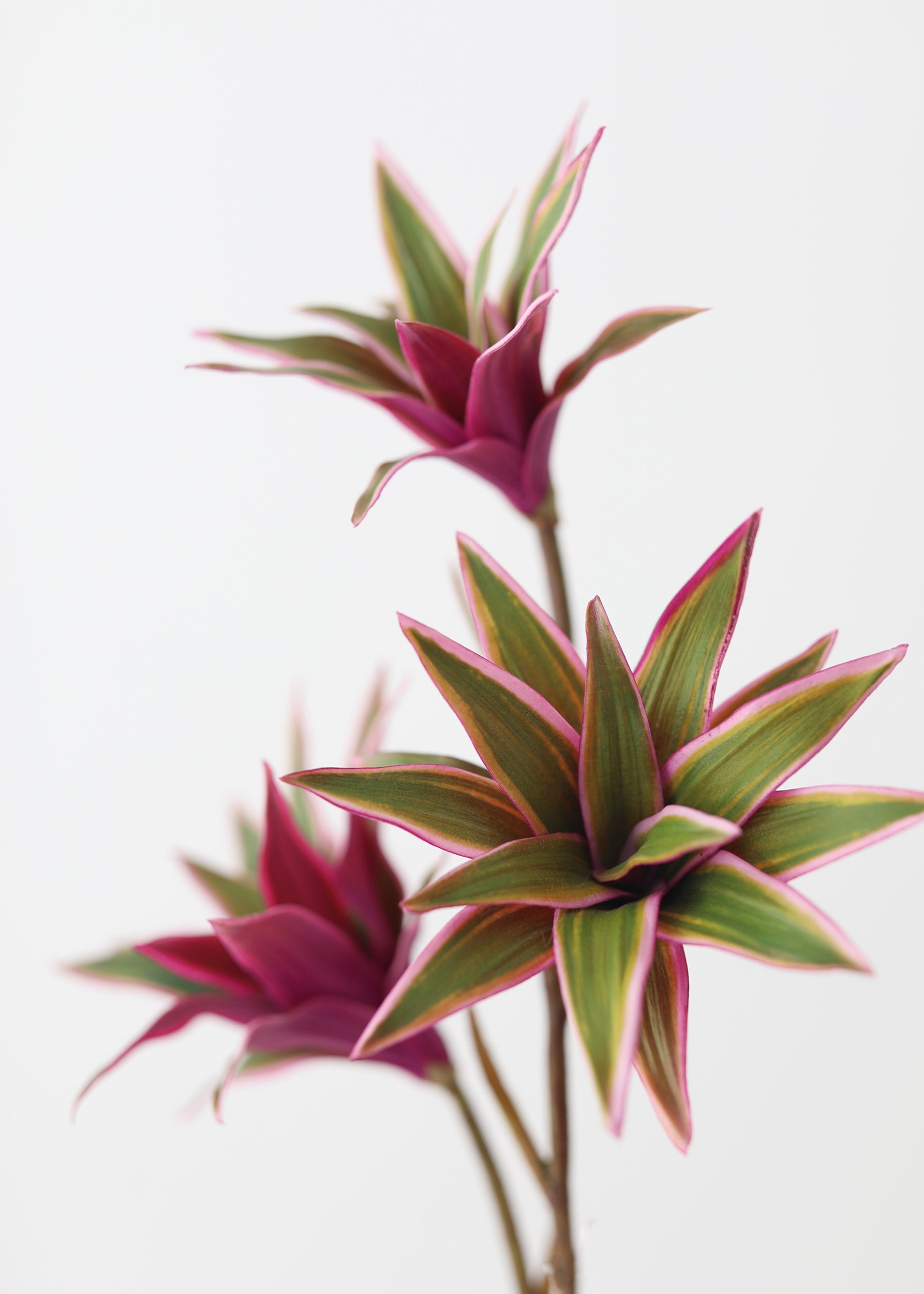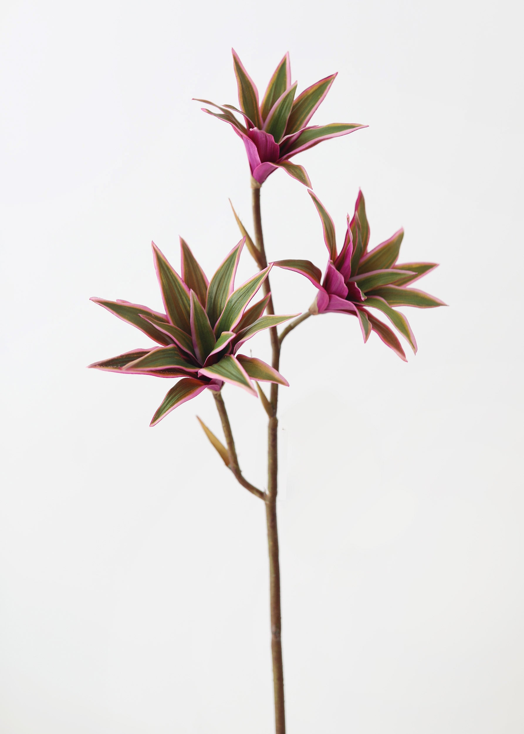 Find faux succulents, like this gorgeous fuchsia pink and green variegated artificial plastic dracaena succulent stem. Simply style it in a pot to use as a tabletop plant, or add it to your floral arrangements for textured details.
