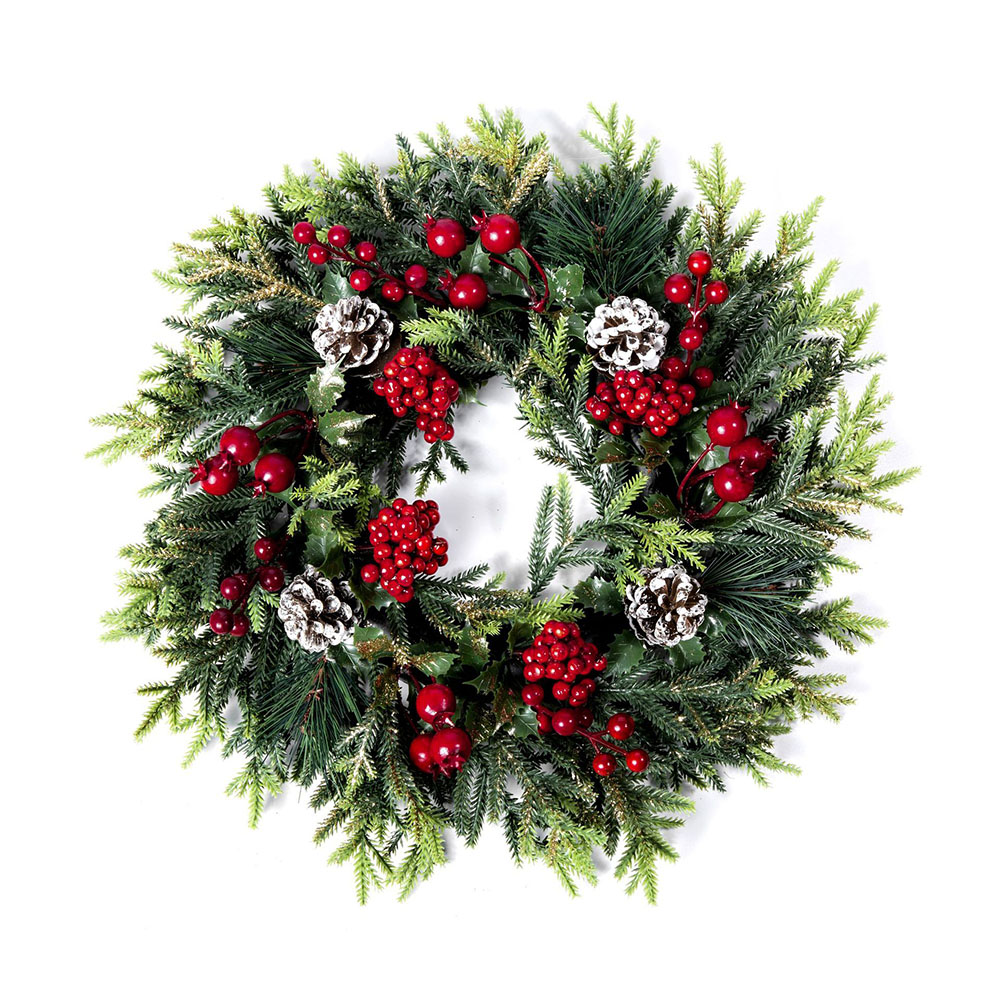 - Exterior design: this is a round Christmas wreath decoration, surrounded by a circle of green pine needles, with 3 ~ 4 real pine cones in the center and some red fruits around, the appearance is bright and beautiful. The round wreath is easy to hang and effortless.