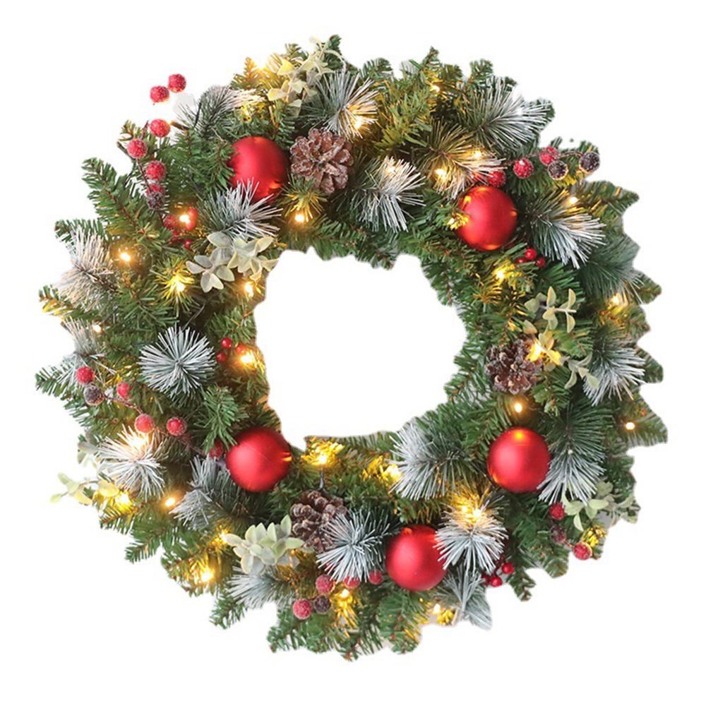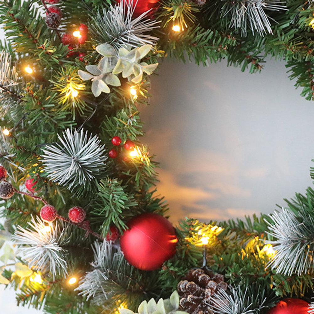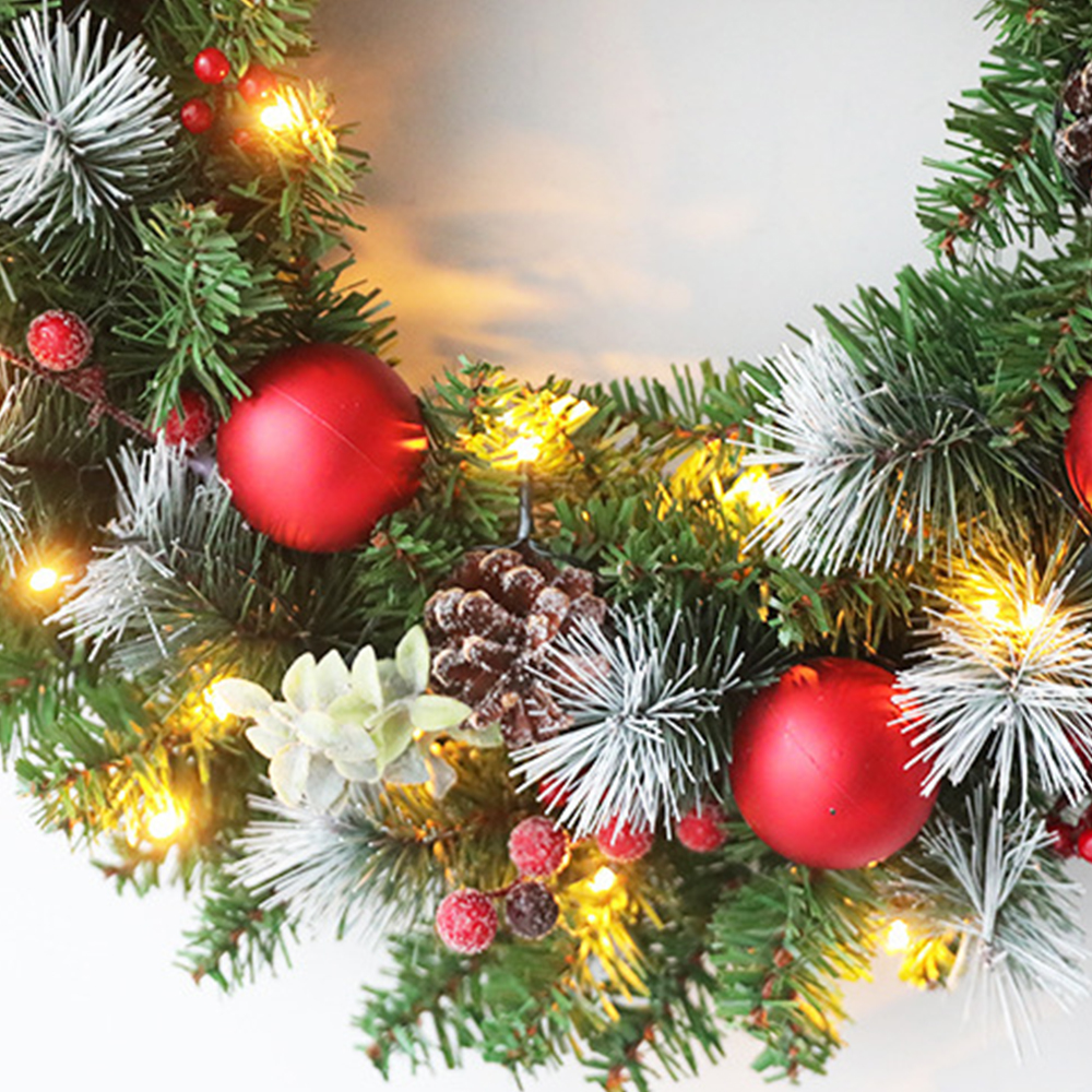 - Style: classic round garland, the outer ring is a layer of green pine needles, inlaid with many Christmas elements, including pine cones, red balls, flowers, etc., the complex is delicate and beautiful.