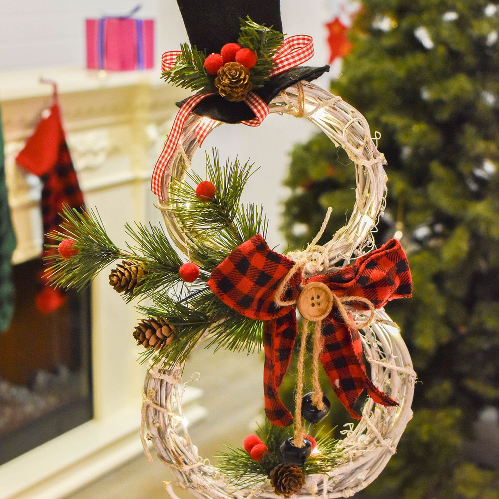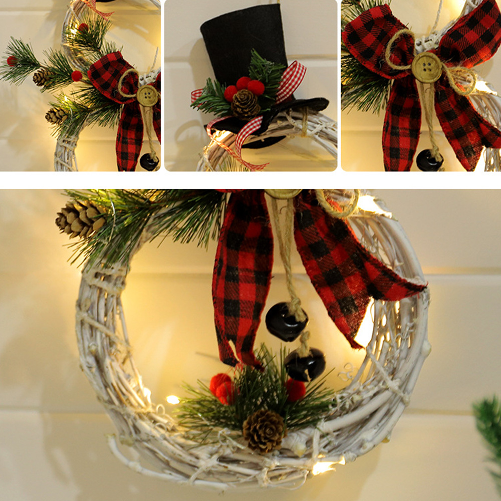 - Design: this Christmas wreath looks like a snowman as a whole, with hands made of pine needles on either side and decorated with round red balls and pine cones. There is a bow tie in the middle and an inlaid wooden button. A high-pointed black hat is placed on the top, which looks cute and interesting as a whole. There are also LED lights installed around the garland for lighting. The wreath has a string at the top for easy and effortless hanging.