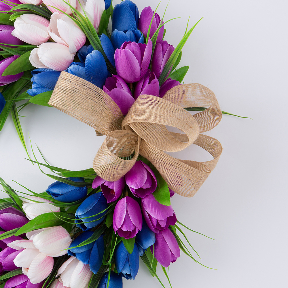 Appearance design: classic round garland, simple and elegant. Embellished with blue-purple tulips and bow ribbons, matched with simulated green leaves and natural rattan, the overall tone is fresh and natural.