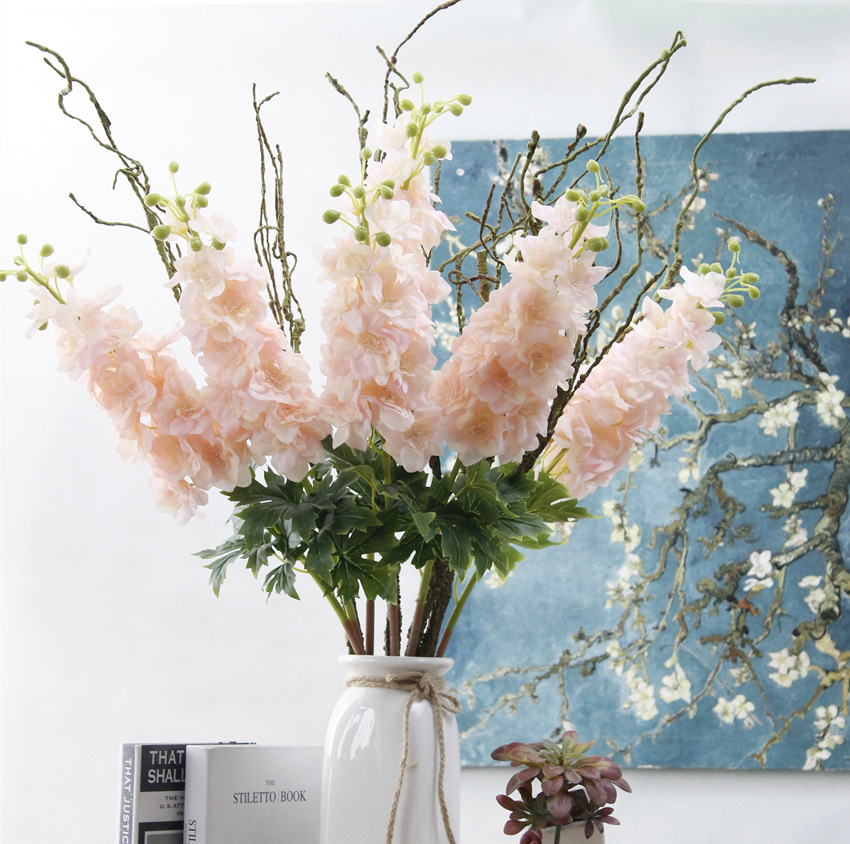 Add some playful charm to your bouquets and faux floral arrangements with these whimsical artificial pink lavender delphinium wildflower stems. The delicate petals feature tones of pink lavender, ivory, with a hint of cream green.