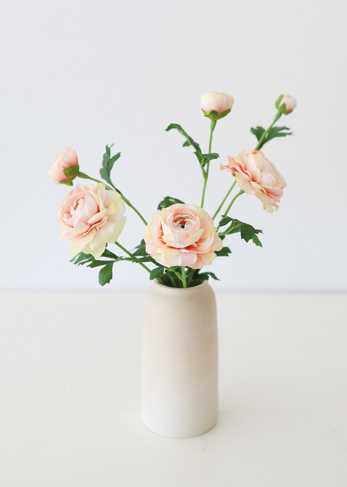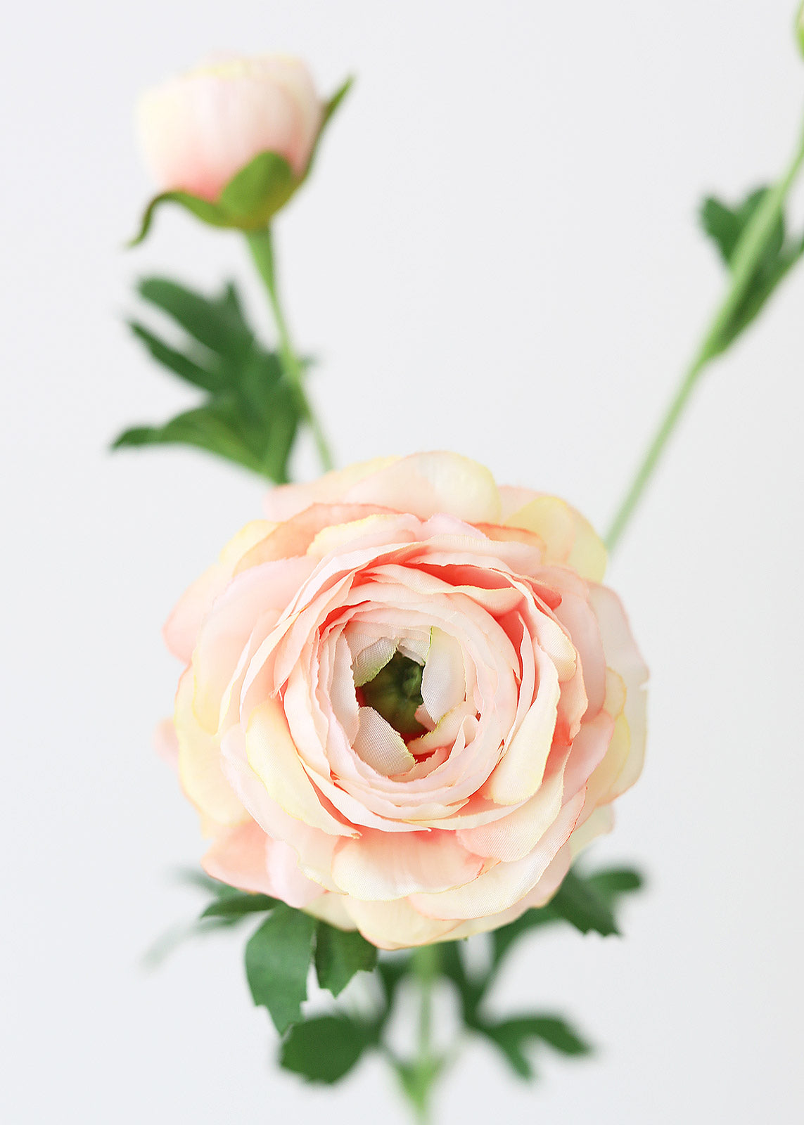 Find fake flowers in pretty pastels, like this silk ranunculus stem in light pink with light yellow highlights. The color gradient is perfectly refreshing, making these artificial blooms a favorite to cheer up your everyday vase arrangements.