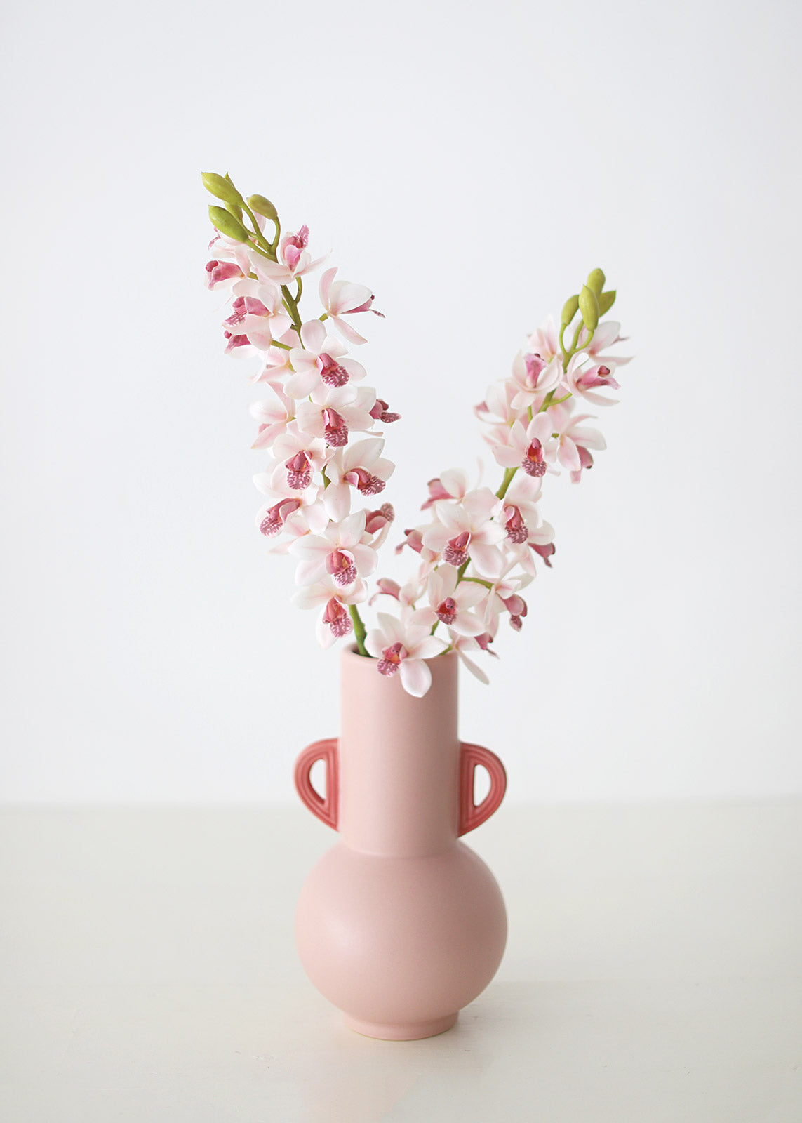 Find tropical fake flowers, like this cymbidium orchid spray in a beautiful light pink with mauve centers. Simply style the artificial orchids in your favorite vase to enjoy permanent botanicals that last.