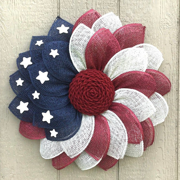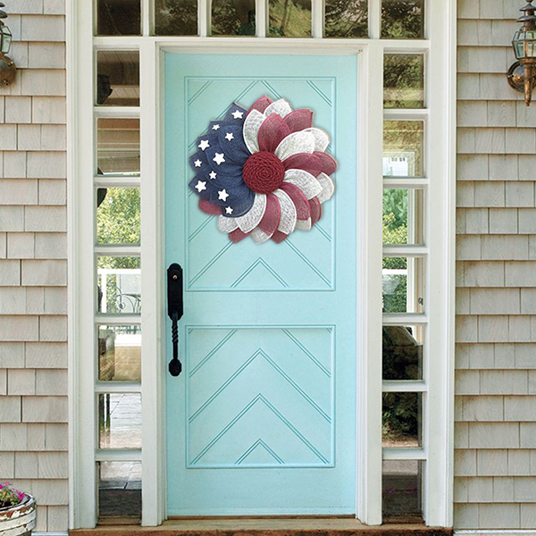 Made of Poly Burlap with painted wood star accent and braided cord center. Make a statement at your front door with this rich patriotic wreath.