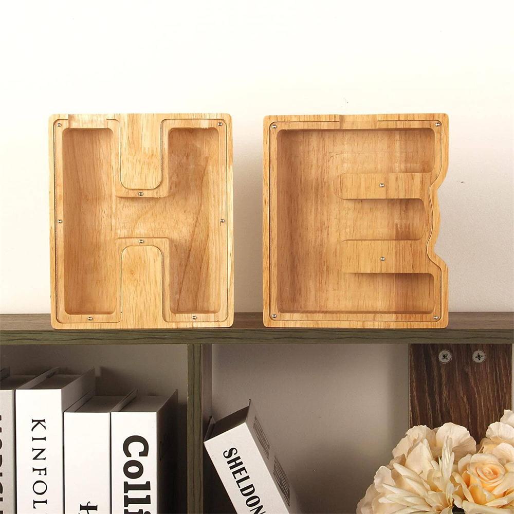 Appearance: The cute wooden alphabet money jar is a practical and nice looking gift for your child. The name can be spelled out using the included letter stickers to become an exclusive money jar. When empty, it can be used as a decoration for your home.