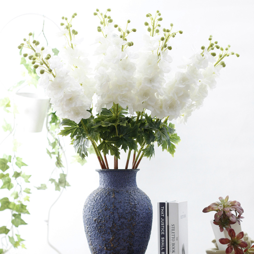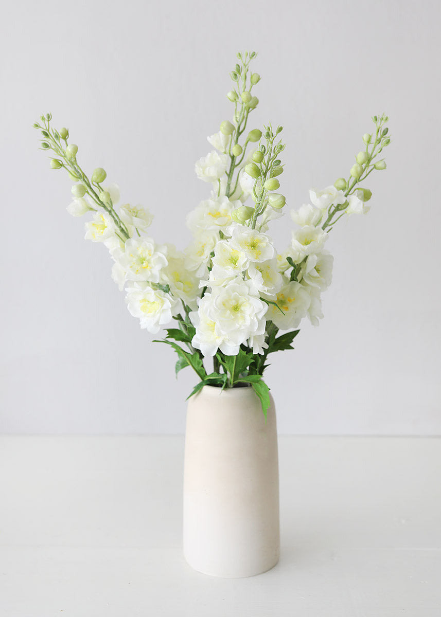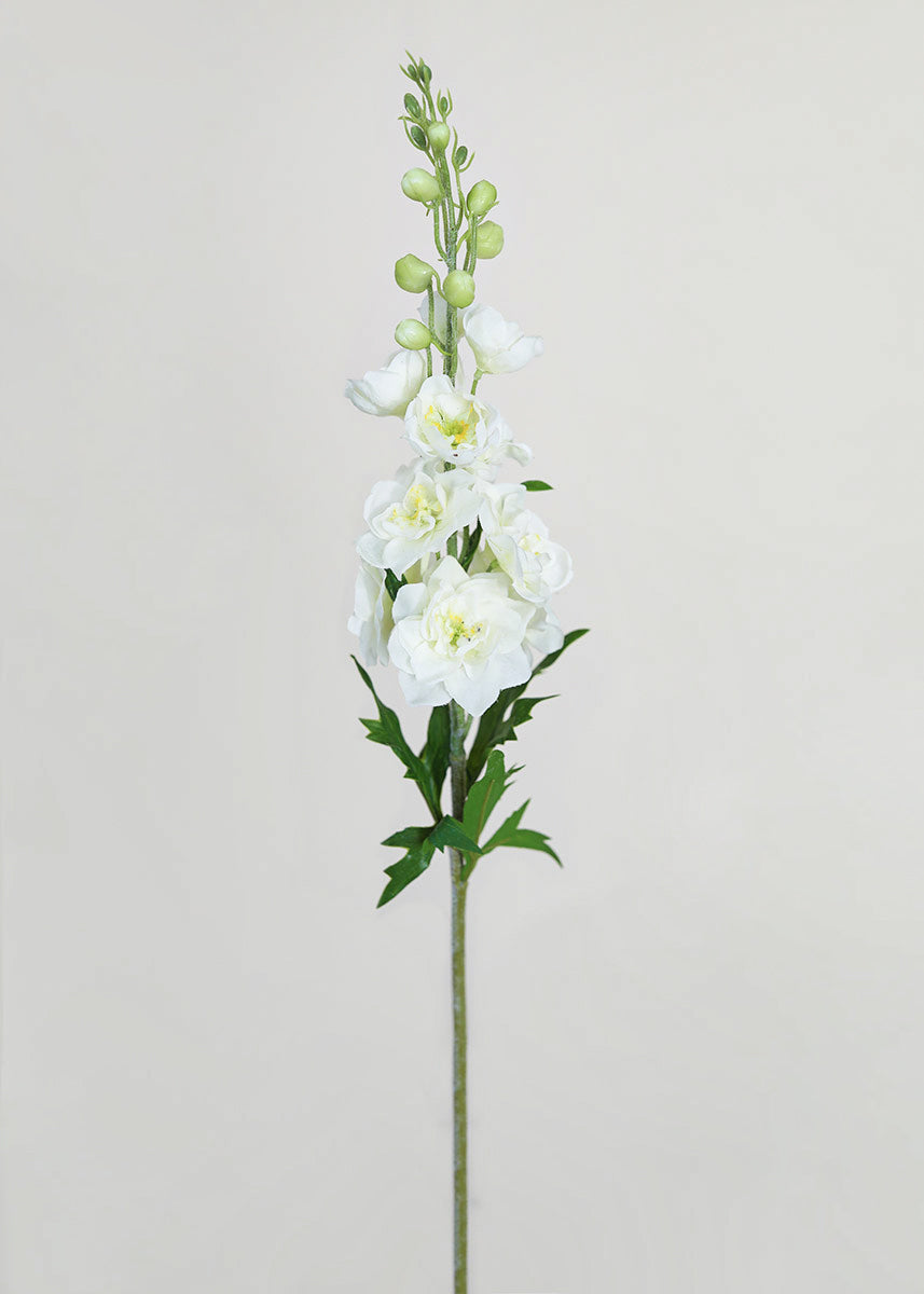 These aren’t your grandmother's fake flowers. These white delphinium wildflowers feel as real as they look, with real-touch petals that feel damp to the touch. The flocked stem adds an extra layer of realism that makes this stem truly irresistible. The cream-white petals offer a soft yellow interior with a pistachio green plastic detail in the center. In true Larkspur wildflower fashion, this faux beauty mimics nature with glistening buds that form the signature “spike” of the delphinium and this majestic stem will draw attention from a distance.