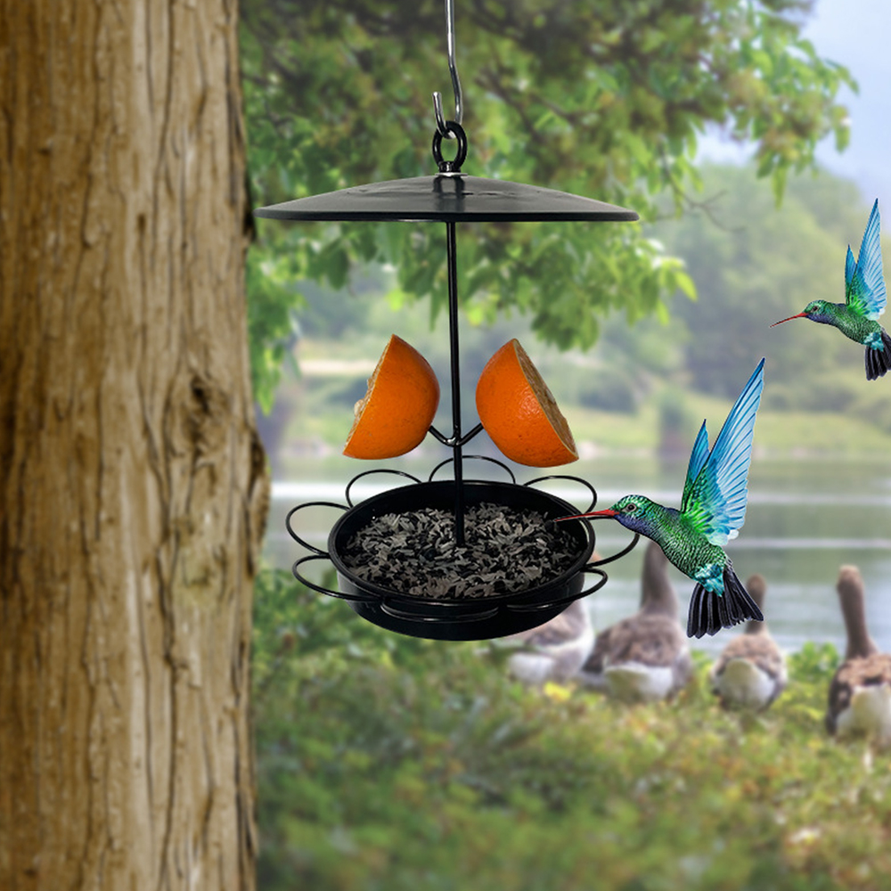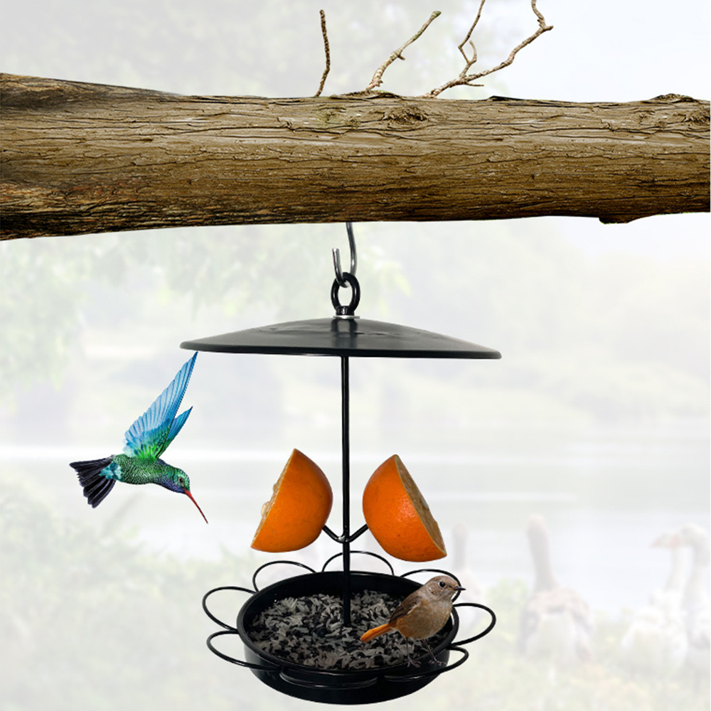 Small rainproof wrought iron bird feeder with fruit inserted outdoors