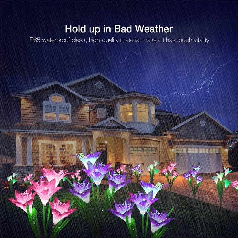 🌷【COLOR CHANGING LIGHT】This outdoor solar garden stake lights includes 1 packs of Flower lights, each pack has 4 lily flowers. 7 color-changing promote the desire ambiance of any occasion, whether it is for a backyard event, or just the finishing touch on your outdoor masterpiece.