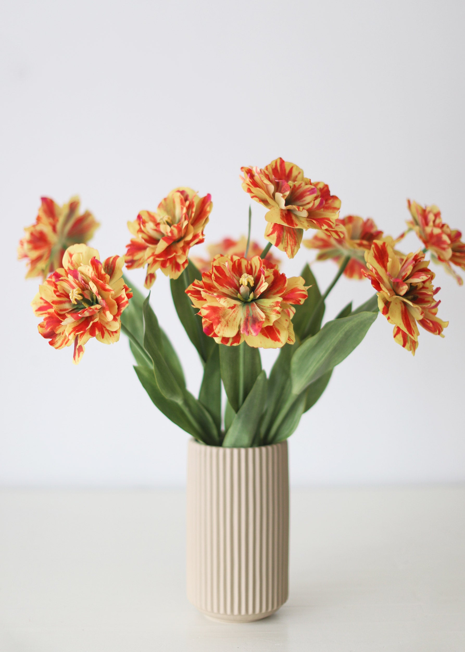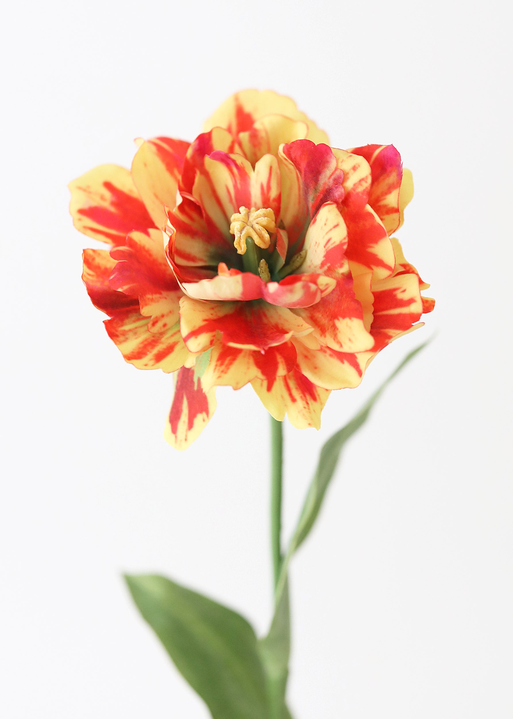 Looking for silk tulips? Choose this artificial tulip flowers stem in yellow with splashes of red. It offers the perfect pop of color to add to your spring vase arrangement.