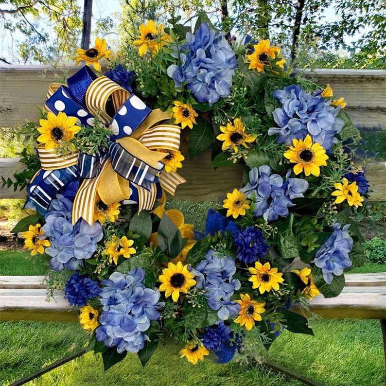 🎈Small sunflowers with blue hydrangeas and yellow and blue ribbon. This wreath is perfect to welcome spring and take you through the summer.![]()