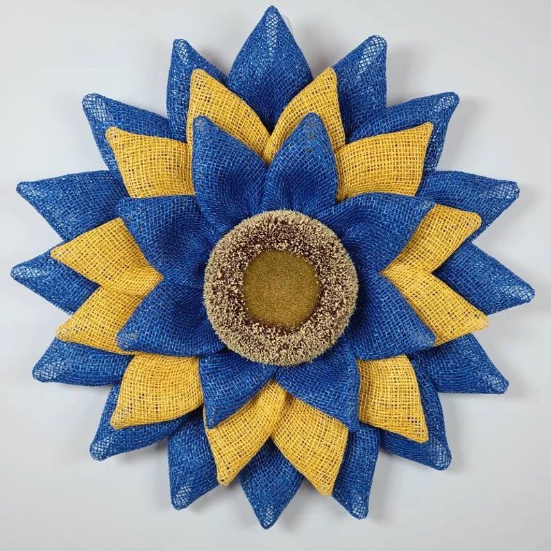 The flower features royal blue petals on the top and yellow petals on the bottom, representing the flag of the invaded country. The styrofoam center resembles the center of a sunflower, the National flower of the invaded country. This wreath measures about 20" in diameter and about 4" in depth.