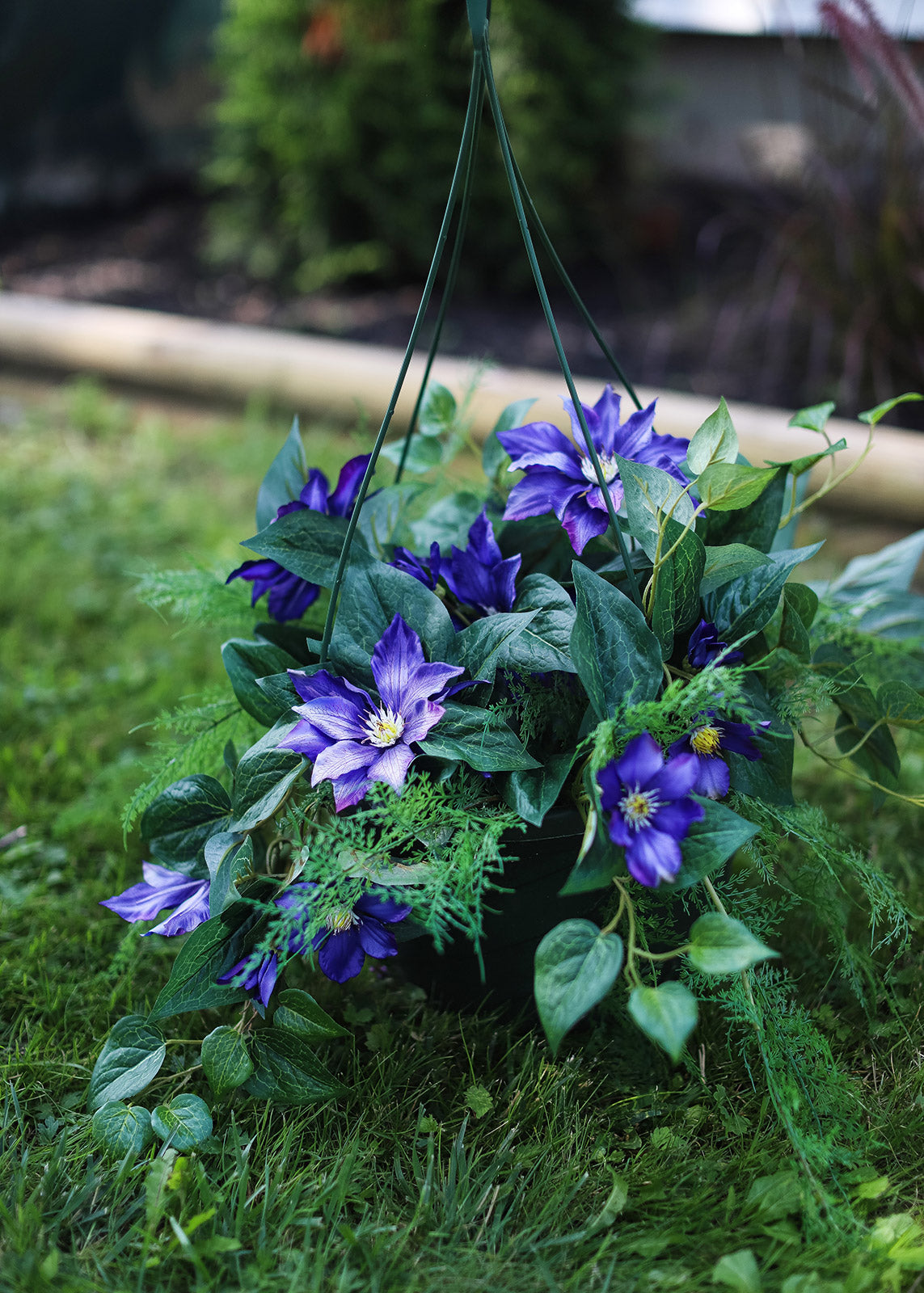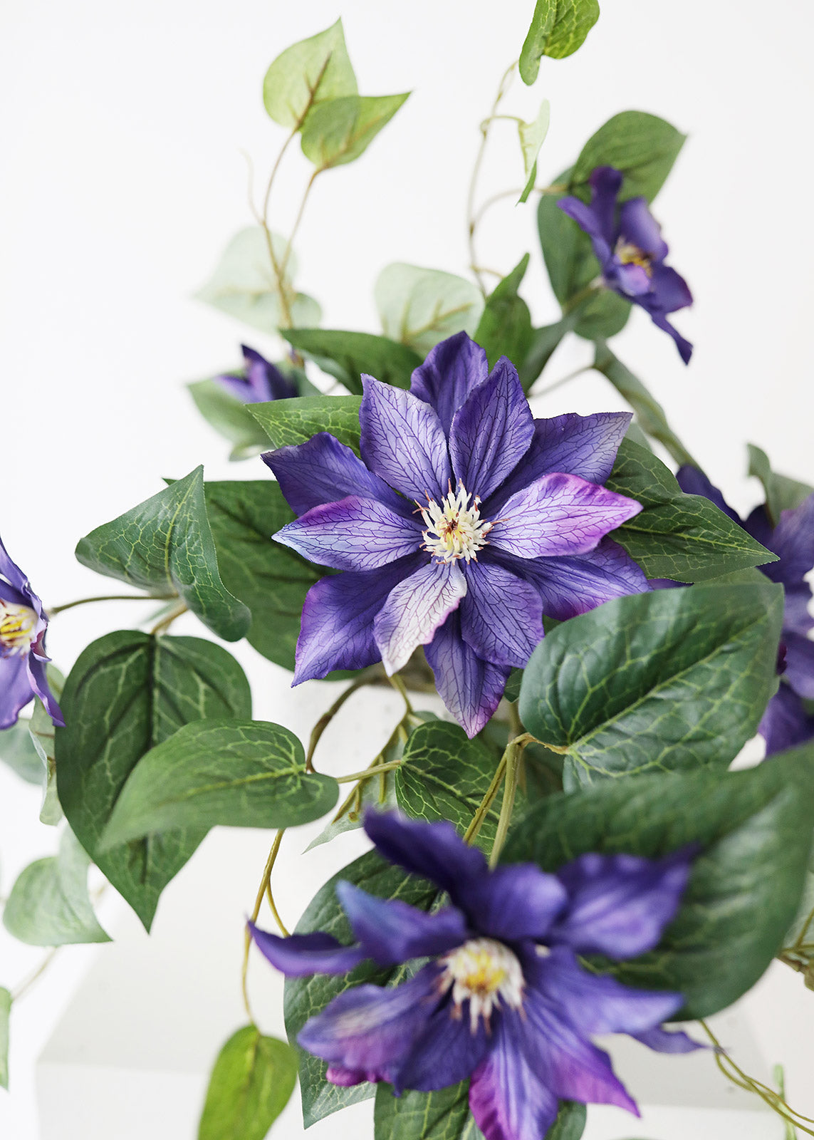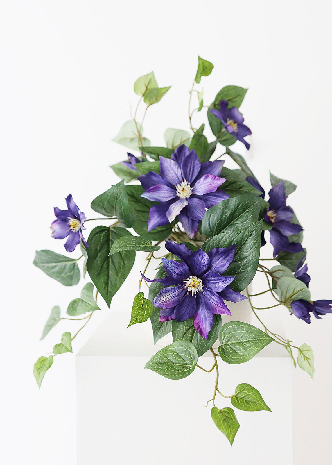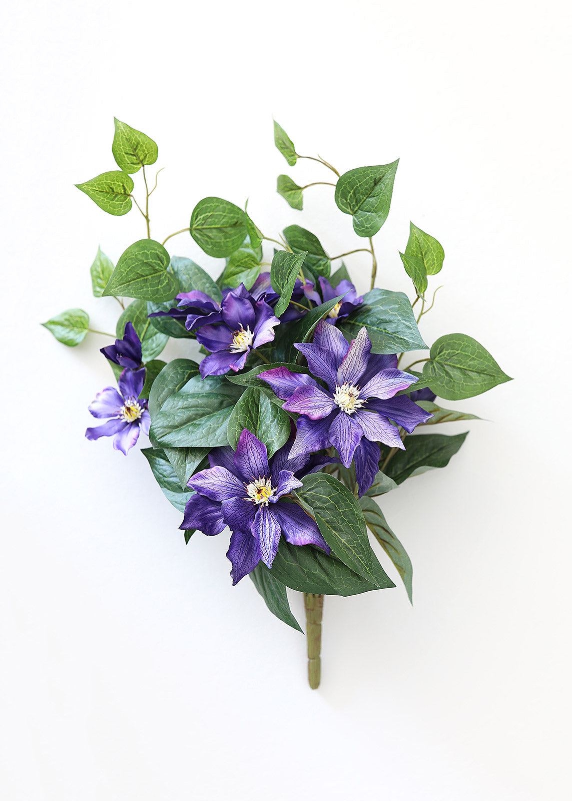 Beautiful, artificial outdoor clematis wildflower bush in purple with hints of fuchsia is the perfect silk flower bush to enjoy year-round. Perfect to bring a gorgeous spring touch to your outdoor floral centerpieces!