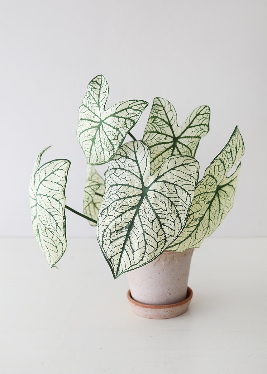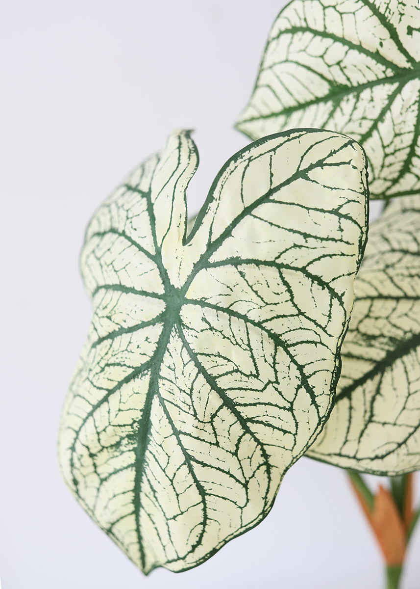 Bring the tropics into your home with this variegated tropical Caladium plant. These cream green and green variegated silk leaves offer an oversized elephant ear shape, and a smooth green wired stem to easily give shape and dimension to your faux plant.